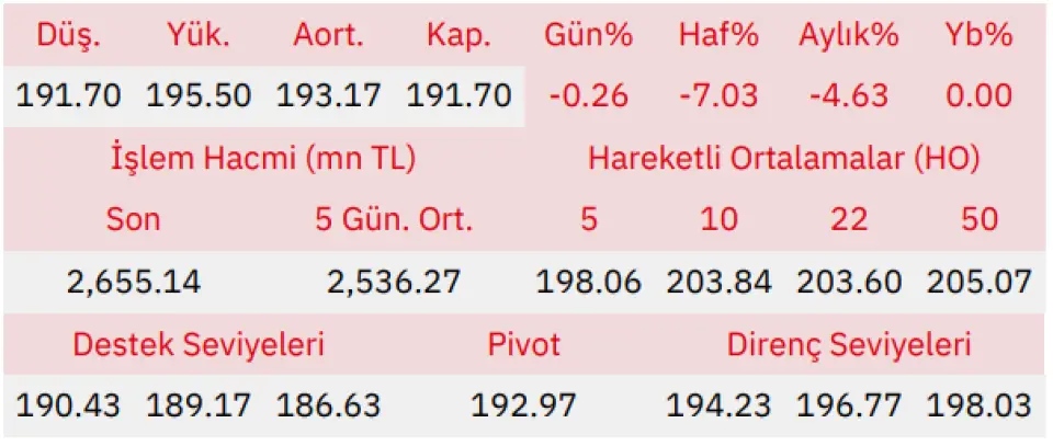 Gün içinde en düşük 191.70 en yüksek 195.50 seviyesini gören Pegasus Hava Taşımacılığı hissesinin günü %0.26 kayıpla tamamladığı gözlenmektedir. Pivot seviye 192.97 seviyesinden geçmekte olup, aşağı yönlü hareketlerde birinci destek 190.43, ikinci destek ise 189.17 seviyesinden geçmektedir. Dirençler ise sırasıyla 194.23, 196.77 seviyelerinden geçmektedir. Bu aşamada endeksin 5 günlük HO seviyesinin %3.21 altında, 22 günlük HO seviyesinin ise %5.84 altında hareket ettiği dikkat çekmektedir. Son gün işlem hacmi ise bu aşamada 5 günlük ortalama işlem hacminin % 4.69 üstünde gerçekleşmiştir.