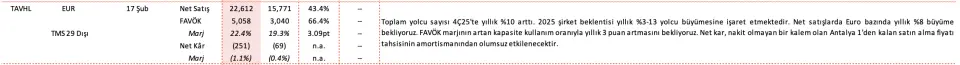 - "Toplam yolcu sayısı 4Ç25'te yıllık %10 arttı. 2025 şirket beklentisi yıllık %3-13 yolcu büyümesine işaret etmektedir. Net satışlarda Euro bazında yıllık %8 büyüme bekliyoruz. FAVÖK marjının artan kapasite kullanım oranıyla yıllık 3 puan artmasını bekliyoruz. Net kar, nakit olmayan bir kalem olan Antalya 1'den kalan satın alma fiyatı tahsisinin amortismanından olumsuz etkilenecektir."