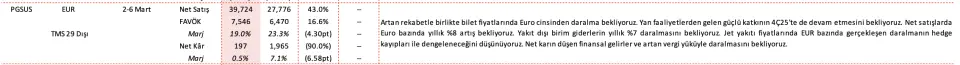 - "Artan rekabetle birlikte bilet fiyatlarında Euro cinsinden daralma bekliyoruz. Yan faaliyetlerden gelen güçlü katkının 4Ç25'te de devam etmesini bekliyoruz. Net satışlarda Euro bazında yıllık %8 artış bekliyoruz. Yakıt dışı birim giderlerin yıllık %7 daralmasını bekliyoruz. Jet yakıtı fiyatlarında EUR bazında gerçekleşen daralmanın hedge kayıpları ile dengeleneceğini düşünüyoruz. Net karın düşen finansal gelirler ve artan vergi yüküyle daralmasını bekliyoruz."
