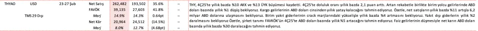 - "Kargo gelirlerinin ABD doları cinsinden yıllık yatay kalacağını tahmin ediyoruz. Özetle, net satışların yıllık bazda %11 artışla 6,2 milyar ABD dolarına ulaşmasını bekliyoruz. Birim yakıt giderlerinin crack marjlarındaki yükselişle yıllık bazda %4 artmasını bekliyoruz. Yakıt dışı giderlerin yıllık %2 daralmasını bekliyoruz Özetle, şirket tanımı FAVKÖK’ün 4Ç25'te ABD doları bazında yıllık %5 artacağını tahmin ediyoruz. Faiz gelirlerinin düşmesiyle net karın ABD doları bazında yıllık bazda %30 daralacağını tahmin ediyoruz."