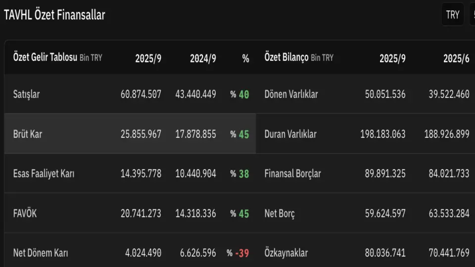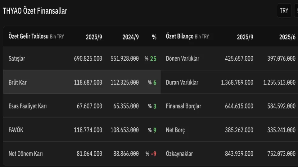 - "Türk Hava Yolları (THYAO), 2025 yılı üçüncü çeyreğinde açıklamış olduğu finansallarda beklentilere paralel satış geliri ve net kar açıkladı. Cirodaki artış dikkat çekici ancak maliyet baskısı brüt kar artışını sınırlamış. Buna ek olarak opersonel gider baskısının artarak devam etmesi net faaliyet karının geçen yıla göre gerilemesine yol açtı."