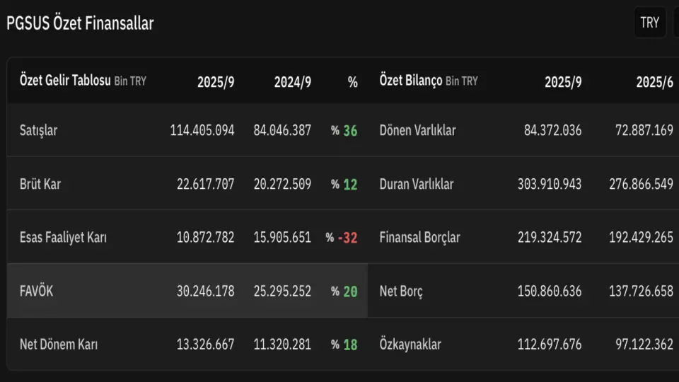 - "Pegasus (PGSUS), 2025 yılı üçüncü çeyreğinde açıklamış olduğu finansallar ile birlikte piyasa beklentilerine paralel bir sonuç açıkladı. Şirketin 9A25 döneminde bir önceki yılın aynı dönemine göre dış hat misafir sayısında yaşanan artış dikkat çekici oldu. Yeni nesil uçakların şirketin filosunda toplam payı %88 seviyesinde seyretmektedir."