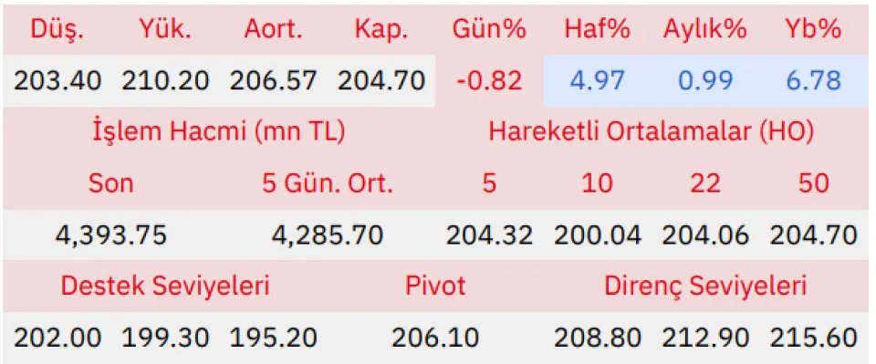 Gün içinde en düşük 203.40 en yüksek 210.20 seviyesini gören Pegasus Hava Taşımacılığı hissesinin günü %0.82 kayıpla tamamladığı gözlenmektedir. Pivot seviye 206.10 seviyesinden geçmekte olup, aşağı yönlü hareketlerde birinci destek 202.00, ikinci destek ise 199.30 seviyesinden geçmektedir. Dirençler ise sırasıyla 208.80, 212.90 seviyelerinden geçmektedir. Bu aşamada endeksin 5 günlük HO seviyesinin %0.19 üstünde, 22 günlük HO seviyesinin ise %0.31 üstünde hareket ettiği dikkat çekmektedir. Son gün işlem hacmi ise bu aşamada 5 günlük ortalama işlem hacminin % 2.52 üstünde gerçekleşmiştir.