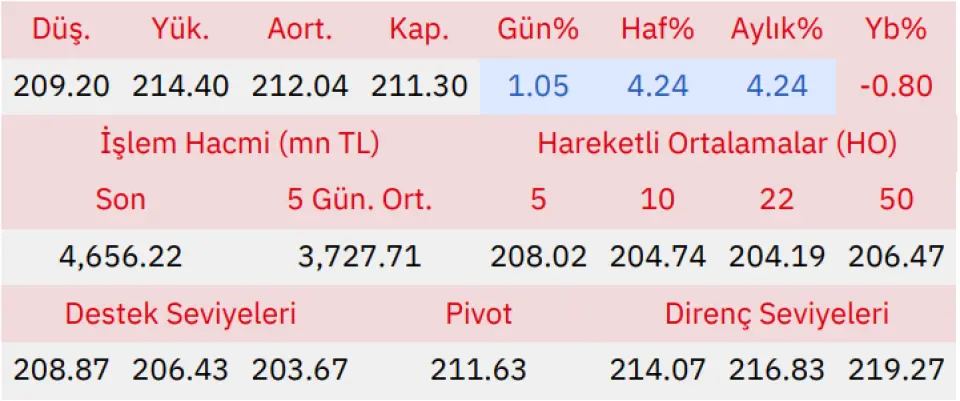 Gün içinde en düşük 209.20 en yüksek 214.40 seviyesini gören Pegasus Hava Taşımacılığı hissesinin günü %1.05 kazançla tamamladığı gözlenmektedir. Pivot seviye 211.63 seviyesinden geçmekte olup, aşağı yönlü hareketlerde birinci destek 208.87, ikinci destek ise 206.43 seviyesinden geçmektedir. Dirençler ise sırasıyla 214.07, 216.83 seviyelerinden geçmektedir. Bu aşamada endeksin 5 günlük HO seviyesinin %1.58 üstünde, 22 günlük HO seviyesinin ise %3.48 üstünde hareket ettiği dikkat çekmektedir. Son gün işlem hacmi ise bu aşamada 5 günlük ortalama işlem hacminin % 24.91 üstünde gerçekleşmiştir.