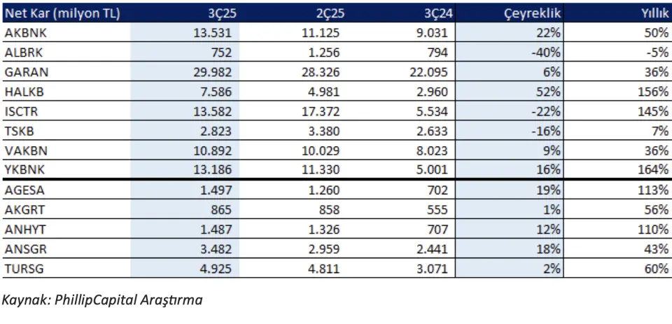 - "Bankalar: Temmuz ayının ardından başlayan kademeli faiz indirimlerinin bankacılık sektörüne yansıması sınırlı ama gelecekteki çeyreklerde daha güçlü bir etki bekleniyor. Mevduat faizleri aşağı gelirken kredi faizleri görece yüksek kalıyor, bu da spread’lerin genişlemesini ve net faiz marjının toparlanmasını destekliyor. Swap maliyetlerinin TL mevduat maliyetlerinin altında kalması sebebiyle sektör swap maliyetinde bir artış öngörmekteyiz. Sektörün genelinde kredi artışının çeyreklik %8 kadar olduğunu ve bu artışın ihtiyaç kredileri, kredi kartları ve KOBİ tarafından desteklendiği söylenebilir. NPL rasyosunun da sektör genelinde yaklaşık 13 baz puan arttığını tahmin ediyoruz. Özellikle KKM çözülmeleri sebebiyle vadesiz YP mevduatta %12 kadar bir yükseliş beklenebilir. Kapsama alanımızdaki bankaların toplam kârının çeyreklik %5,2 artmasını bekliyoruz. Bankalar 17.10.2025 itibarıyla 2,42x F/K ve 0,70x F/DD çarpanlarıyla işlem görmektedir."