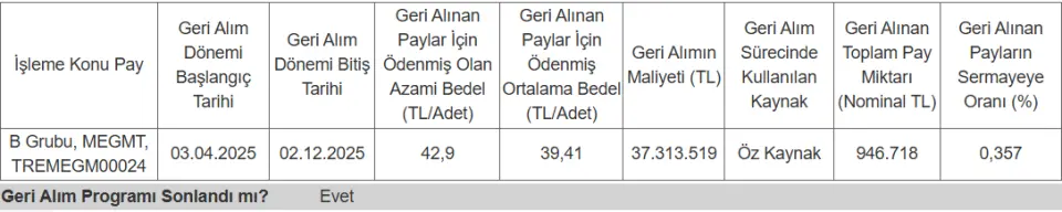 MEGMT pay geri alım programını sonlandırdığını açıkladı. Süreç boyunca, 37.313.519 TL tutarında 946.718 lot hisse alımı yapılmış olup geri alınan payların sermayeye oranı %0,3573 olarak gerçekleşti.
