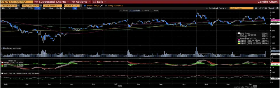 Amazon (AMZN) hissesi, dün dördüncü çeyrek finansallarının ardından yüksek sermaye harcaması öngörüsü ve beklentilerin altında kalan operasyonel kâr görünümü nedeniyle güçlü satış baskısıyla karşılaştı ve günü 222,69 dolar seviyesinde tamamladı. Yapay zekâ ve altyapı yatırımlarına yönelik agresif harcama planlarının nakit akışı ve kârlılık üzerinde baskı yaratacağı endişesi fiyatlamalarda belirleyici olurken, teknik tarafta hisse 50, 100 ve 200 günlük hareketli ortalamaların altında kalarak zayıf görünümünü sürdürdü.