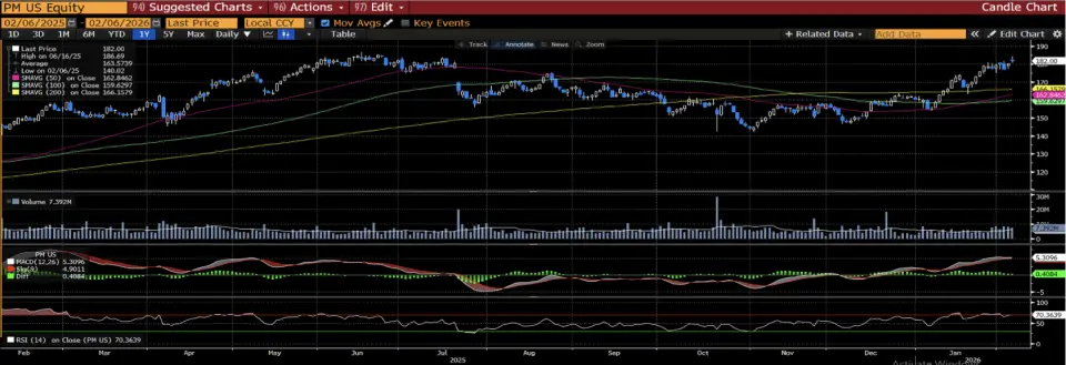 Philip Morris International (PM) hissesi, dün 182,00 dolara yükselerek günü hafif bir artışla tamamladı. Hisse, 50, 100 ve 200 günlük hareketli ortalamaların üzerinde işlem görerek teknik olarak güçlü bir yukarı trend sergiliyor; ancak yüksek seviyelerde olması kısa vadede kar realizasyonu riskine işaret ediyor. 182,00 dolar kapanışı, zirve seviyesi olan 184,40 doların sadece %1 altında bulunurken, aşağıda 180,50 ve 178,55 dolar seviyeleri kritik destek noktaları olarak öne çıkıyor.