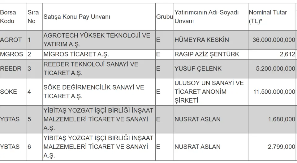 Bu işleme konu olan bir şirket oldu. Bu şirket, SÖKE DEĞİRMENCİLİK SANAYİ VE TİCARET A.Ş. olurken, çeşitli yatırımcılar E tipi işlem görmeyen paylarının bir miktarını borsada işlem gören tipe dönüştürmek için başvuru yaptı.