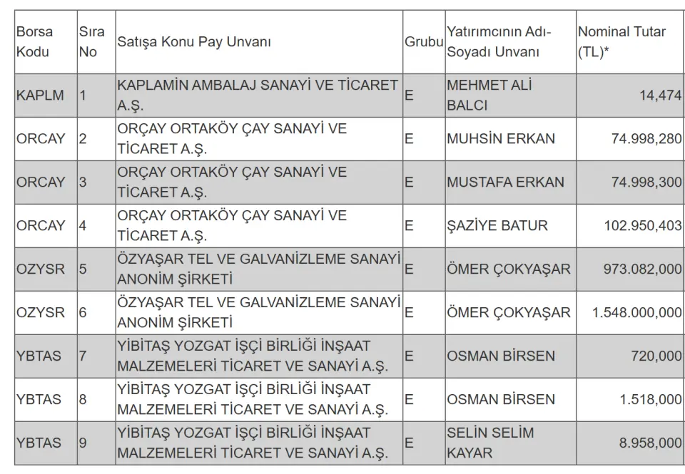 ÖZYAŞAR TEL VE GALVANİZLEME SANAYİ ANONİM ŞİRKETİ olurken, çeşitli yatırımcılar E tipi işlem görmeyen paylarının bir miktarını borsada işlem gören tipe dönüştürmek için başvuru yaptı.
