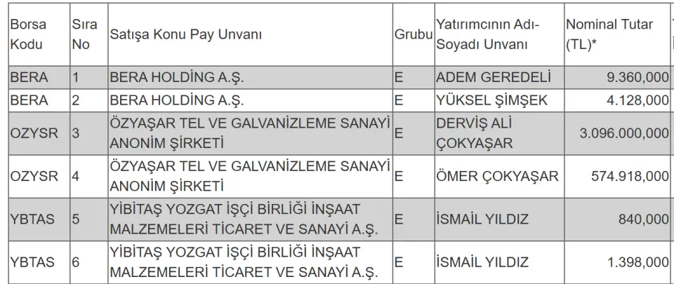 Bu işleme konu olan bir şirket oldu. Bu şirket, ÖZYAŞAR TEL VE GALVANİZLEME SANAYİ ANONİM ŞİRKETİ olurken, çeşitli yatırımcılar E tipi işlem görmeyen paylarının bir miktarını borsada işlem gören tipe dönüştürmek için başvuru yaptı.