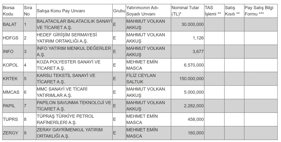 Bu işleme konu olan bir şirket oldu. Bu şirket, BALATACILAR BALATACILIK SANAYİ VE TİCARET A.Ş. olurken, çeşitli yatırımcılar E tipi işlem görmeyen paylarının bir miktarını borsada işlem gören tipe dönüştürmek için başvuru yaptı.