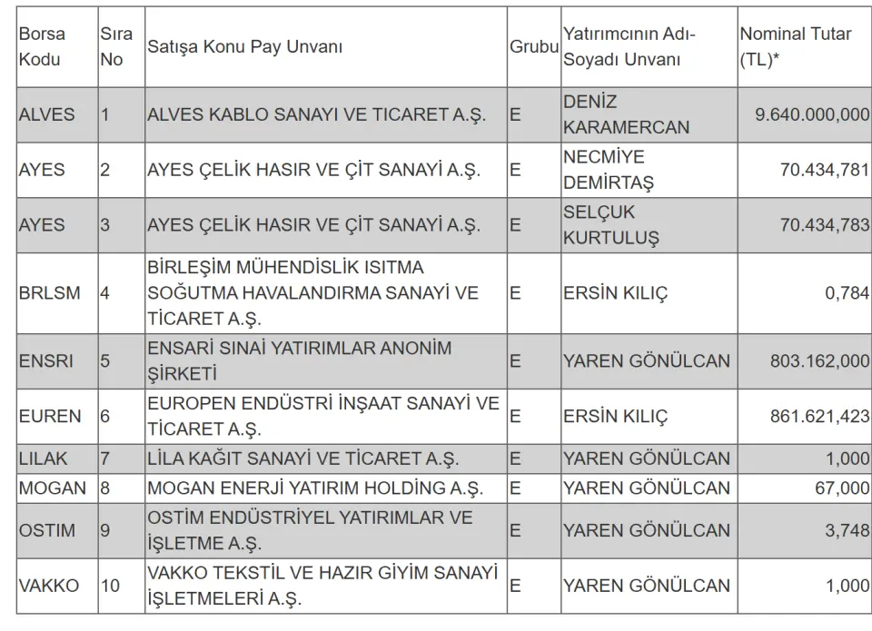 Bu işleme konu olan bir şirket oldu. Bu şirket, ALVES KABLO SANAYI VE TICARET A.Ş. olurken, çeşitli yatırımcılar E tipi işlem görmeyen paylarının bir miktarını borsada işlem gören tipe dönüştürmek için başvuru yaptı.