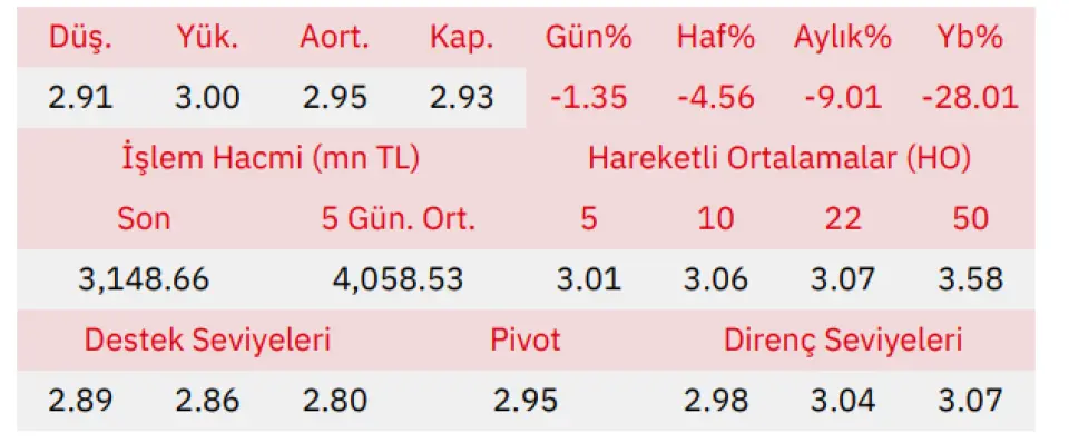 Gün içinde en düşük 2.91 en yüksek 3.00 seviyesini gören Sasa Polyester Sanayi hissesinin günü %1.35 kayıpla tamamladığı gözlenmektedir. Pivot seviye 2.95 seviyesinden geçmekte olup, aşağı yönlü hareketlerde birinci destek 2.89, ikinci destek ise 2.86 seviyesinden geçmektedir. Dirençler ise sırasıyla 2.98, 3.04 seviyelerinden geçmektedir. Bu aşamada endeksin 5 günlük HO seviyesinin %2.72 altında, 22 günlük HO seviyesinin ise %4.62 altında hareket ettiği dikkat çekmektedir. Son gün işlem hacmi ise bu aşamada 5 günlük ortalama işlem hacminin % 22.42 altında gerçekleşmiştir.