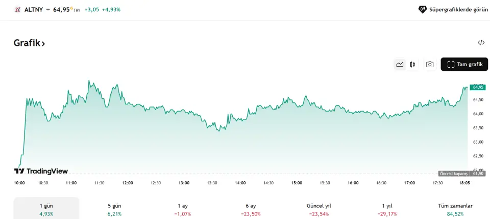 Son işlem gününde fiyat hareketi kısa vadede farklı bir tablo gösterdi. Hisse günü yaklaşık %4 oranında yükselişle tamamladı ve 65 TL seviyesine ulaştı. Böylece son gün içinde pozitif bir fiyat değişimi kaydedildi.