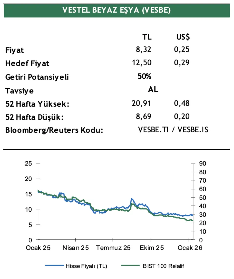 Aracı kurumlardan Şeker Yatırım, Beyaz Eşya Sektörü Aralık 2025 Verilerini değerlendirdi. Şeker Yatırım, Arçelik (ARCLK) ve Vestel Beyaz Eşya (VESBE) için 12 aylık hedef fiyat, hisse tavsiyesi ve getiri potansiyelini duyurdu.