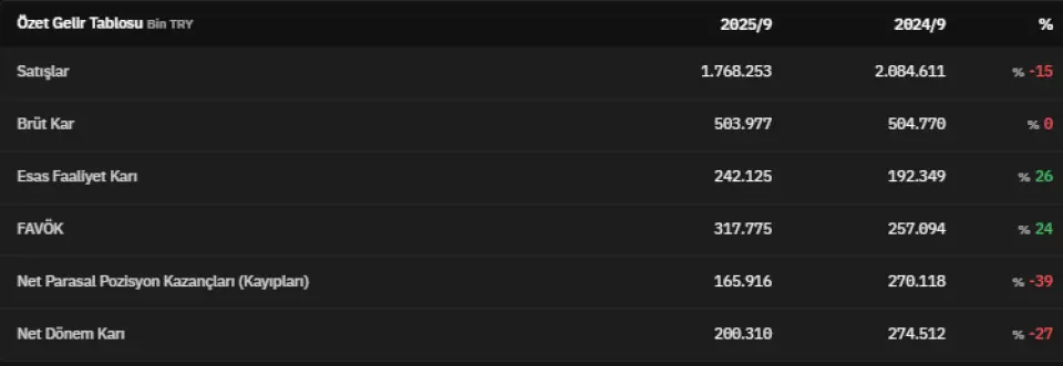 FAVÖK 2025 yılının üçüncü çeyreğinde 317.775.000 TL olarak açıklandı. Net parasal pozisyon kazançları 2025 yılının üçüncü çeyreğinde 165.916.000 TL olarak kaydedildi. Net dönem kârı ise 200.310.000 TL olarak kaydedildi.