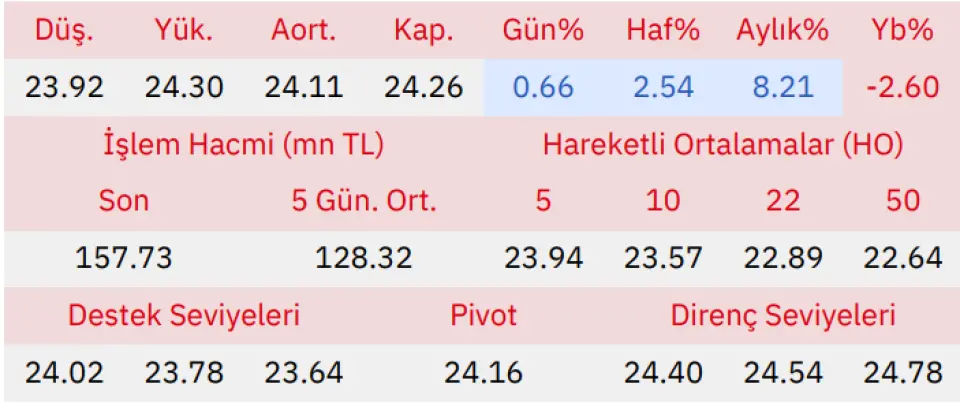 Gün içinde en düşük 23.92 en yüksek 24.30 seviyesini gören Anadolu Anonim Türk Sigorta Şirketi hissesinin günü %0.66 kazançla tamamladığı gözlenmektedir. Pivot seviye 24.16 seviyesinden geçmekte olup, aşağı yönlü hareketlerde birinci destek 24.02, ikinci destek ise 23.78 seviyesinden geçmektedir. Dirençler ise sırasıyla 24.40, 24.54 seviyelerinden geçmektedir. Bu aşamada endeksin 5 günlük HO seviyesinin %1.32 üstünde, 22 günlük HO seviyesinin ise %5.99 üstünde hareket ettiği dikkat çekmektedir. Son gün işlem hacmi ise bu aşamada 5 günlük ortalama işlem hacminin % 22.92 üstünde gerçekleşmiştir.