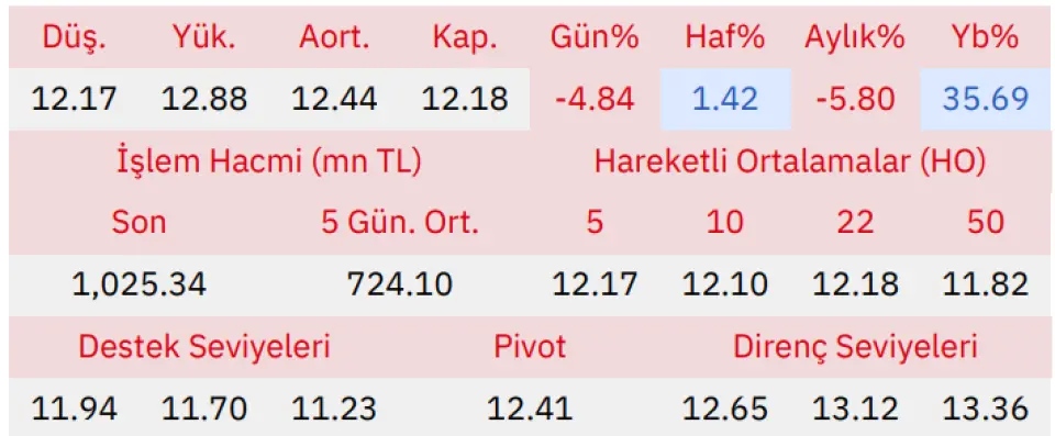 Gün içinde en düşük 12.17 en yüksek 12.88 seviyesini gören Türkiye Sigorta hissesinin günü %4.84 kayıpla tamamladığı gözlenmektedir. Pivot seviye 12.41 seviyesinden geçmekte olup, aşağı yönlü hareketlerde birinci destek 11.94, ikinci destek ise 11.70 seviyesinden geçmektedir. Dirençler ise sırasıyla 12.65, 13.12 seviyelerinden geçmektedir. Bu aşamada endeksin 5 günlük HO seviyesinin %0.12 üstünde, 22 günlük HO seviyesinin ise %0.00 üstünde hareket ettiği dikkat çekmektedir. Son gün işlem hacmi ise bu aşamada 5 günlük ortalama işlem hacminin % 41.60 üstünde gerçekleşmiştir.
