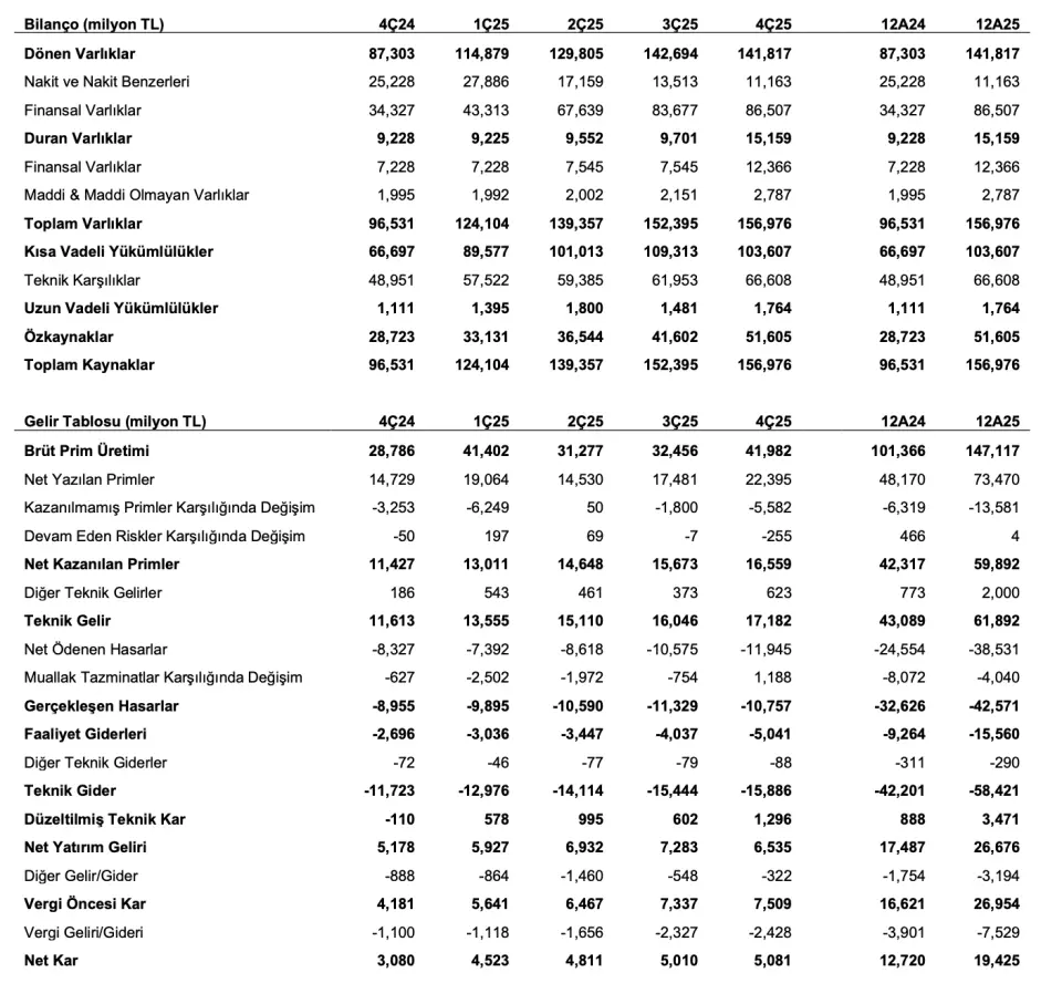- "Brüt prim üretimi, çeyreklik bazda %29 artışla 42,0 milyar TL olarak gerçekleşirken, 12A25’teki prim üretiminde sağlık segmentinin payı 9A25’teki %13 seviyesinden %14’e yükseldi. Şirketin yatırım portföyü çeyreklik bazda %7 artış göstererek 80,9 milyar TL’ye ulaştı (3Ç25: 75,7 milyar TL). 12A25 itibarıyla, şirketin yatırım portföyünde TL mevduatın payı 6 puan düşüşle %6’ya gerilerken TL cinsi devlet & özel sektör tahvilleri %51 ağırlıkla portföyün en büyük varlık sınıfı olmaya devam etti. Net yatırım geliri geçen çeyreğe göre %10 düşüşle 6,5 milyar TL olurken, yıllıklandırılmış getiri oranı 3Ç25’teki %40 seviyesinden %33’e geriledi."