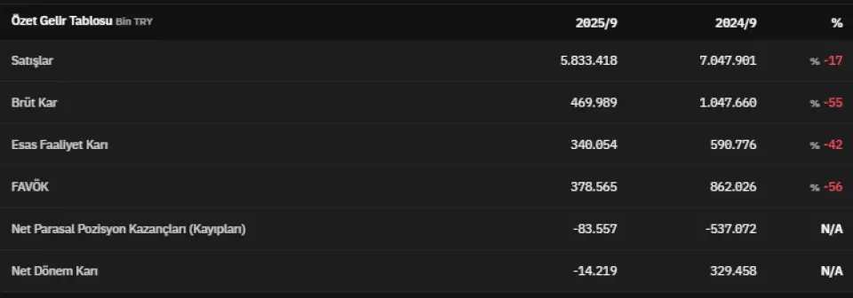 FAVÖK 2025 yılının üçüncü çeyreğinde 378.565.000 TL olarak açıklandı. Net parasal pozisyon kazançları 2025 yılının üçüncü çeyreğinde -83.557.000 TL olarak kaydedildi. Net dönem kârı ise -14.219.000 TL olarak kaydedildi.