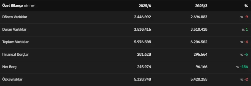 Dönen varlıklar 2025 yılının ikinci çeyreğinde 2.446.092.000 TL olmuştur. 2025 yılının ikinci çeyreğinde 3.530.416.000 TL olarak açıklanan duran varlıklar, 2025 yılının ilk çeyreğinde 3.510.418.000 TL olarak açıklanmıştı. Toplam varlıklar 2025 yılının ikinci çeyreğinde 5.976.508.000 TL olarak açıklandı.