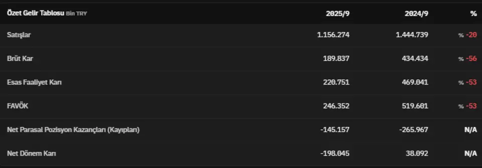 FAVÖK 2025 yılının üçüncü çeyreğinde 246.352.000 TL olarak açıklandı. Net parasal pozisyon kazançları 2025 yılının üçüncü çeyreğinde -145.157.000 TL olarak kaydedildi. Net dönem kârı ise -198.045.000 TL olarak kaydedildi
