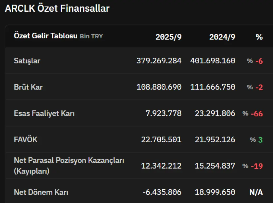 Şirket bu yıl 9 aylık bilançosunda ne yazık ki zarar açıkladı. Hem de devasa bir zarar. ARCLK bu yıl 9 aylık bilançosunda 6.435.806.000 TL zarar açıkladı. Şirketin 18 milyar TL kar rakamında 6 milyar TL zarar rakamına düşüşü hisseyi de olumsuz etkiliyor.