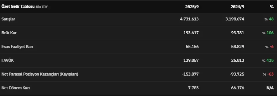 FAVÖK 2025 yılının üçüncü çeyreğinde 139.057.000 TL olarak açıklandı. 2025 yılının ikinci çeyreğinde 26.013.000 TL olarak açıklanan FAVÖK, üçüncü çeyrekte %435 artmış oldu. Net parasal pozisyon kazançları 2025 yılının üçüncü çeyreğinde -153.077.000 TL olarak kaydedildi. Net dönem kârı ise 7.703.000 TL olarak kaydedildi.