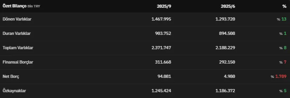 Dönen varlıklar 2025 yılının üçüncü çeyreğinde 1.467.995.000 TL olmuştur. 2025 yılının üçüncü çeyreğinde 903.752.000 TL olarak açıklanan duran varlıklar, 2025 yılının ikinci çeyreğinde 894.508.000 TL olarak açıklanmıştı. Toplam varlıklar üçüncü çeyrekte 2.371.747.000 TL olarak kaydedildi.