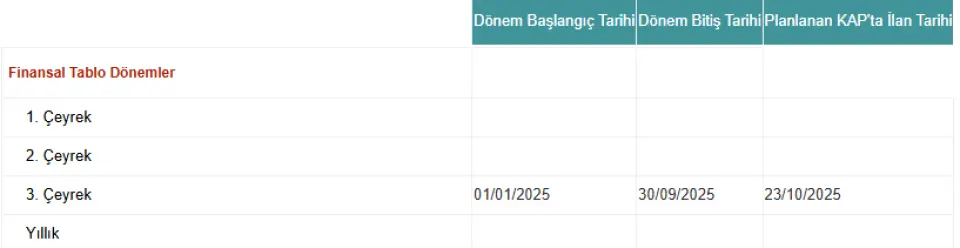Konuyla ilgili şirketten gelen KAP açıklaması haberin devamında yer almaktadır:"Şirketimizin 01.01.2025 – 30.09.2025 hesap dönemine ilişkin konsolide finansal sonuçlarının 23 Ekim 2025 tarihinde Borsa İstanbul seans kapanışı sonrasında kamuya açıklanması planlanmaktadır.