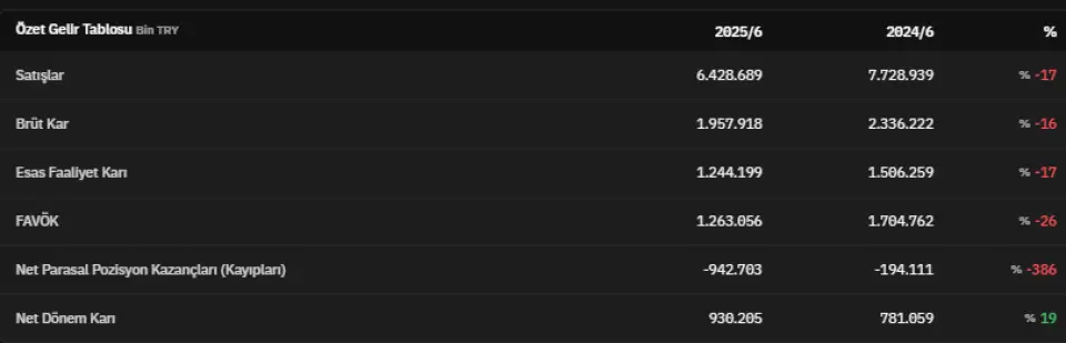 Şirket 2025 yılının ikinci çeyreğinde 6.428.689.000 TL satış gerçekleşti. 2024 yılının aynı dönemine oranla satış geliri %17 azaldı. 2024 yılının ikinci çeyreğinde satışlar 7.728.939.000 TL olarak kayıtlara geçmişti. 2025 yılının ikinci çeyreğinde brüt kar 1.957.918.000 TL olarak açıklandı. 2024 yılının ikinci çeyreğinde ise bu veri 2.336.222.000 TL olarak açıklanmıştı. Esas faaliyet karını 1.244.199.000 TL olarak açıklayan şirket, 2024 yılının ikinci çeyreğinde esas faaliyet karını 1.506.259.000 TL olarak açıklamıştı.FAVÖK 2025 yılının ikinci çeyreğinde 1.263.056.000 TL olarak açıklandı. Net Parasal Pozisyon Kazançları (Kayıpları) 2025 yılının ikinci çeyreğinde -942.703.000 TL olarak açıklandı. Net dönem kârı ise 930.205.000 TL olarak kaydedildi. İlgili veri 2024 yılının ikinci çeyreğinde 781.059.000 TL olarak açıklanmıştı. Böylece net dönem karı, 2025 yılını ikinci çeyreğinde %19 artmış oldu.