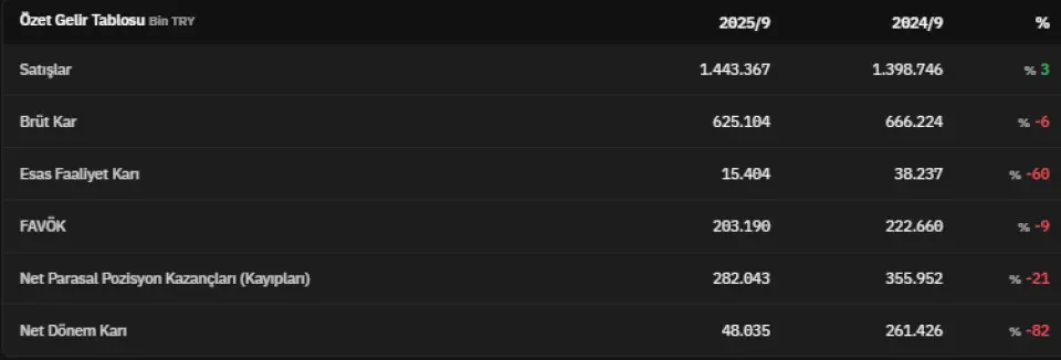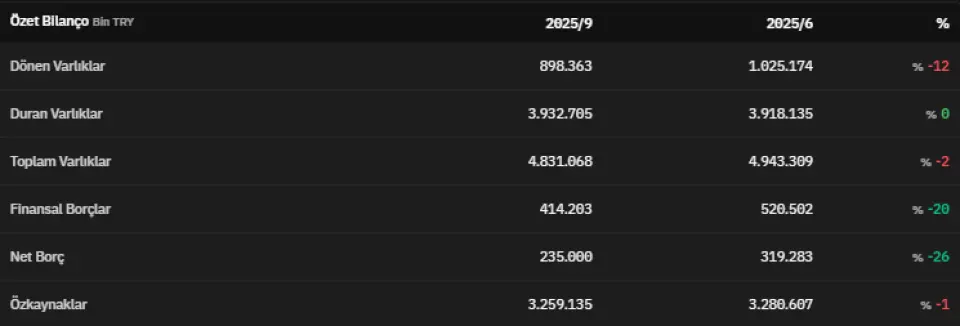 Dönen varlıklar 2025 yılının üçüncü çeyreğinde 898.363.000 TL olmuştur. 2025 yılının üçüncü çeyreğinde 3.932.705.000 TL olarak açıklanan duran varlıklar, 2025 yılının ikinci çeyreğinde 3.918.135.000 TL olarak açıklanmıştı. Toplam varlıklar 2025 yılının üçüncü çeyreğinde 4.831.068.000 TL olarak açıklandı. Finansal borçlar 2025 yılının üçüncü çeyreğinde 414.203.000 TL olarak kaydedildi. 2025 yılının ikinci çeyreğinde 520.502.000 TL olarak açıklanan finansal borçlar, 2025 yılının üçüncü çeyreğinde %20 azalmış oldu.