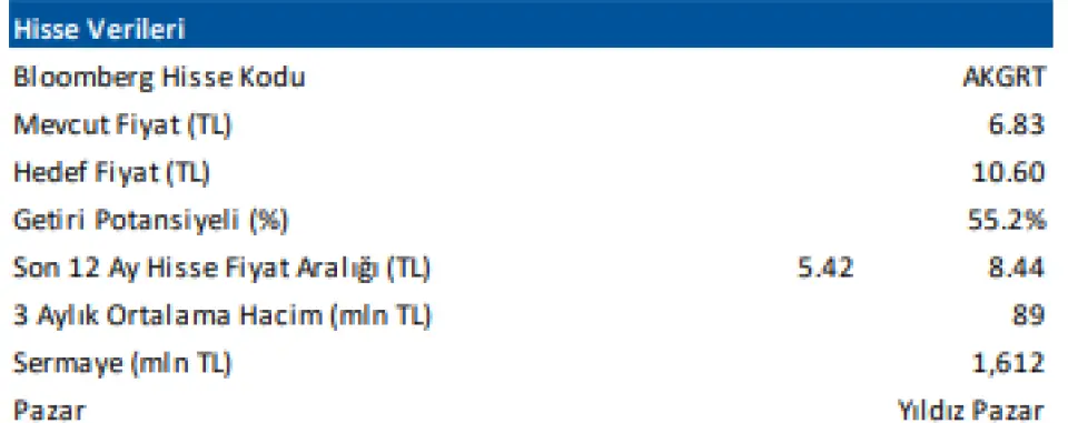 AKGRT geçen yıl 3, çeyrekte 1.163.334.000 TL olan karını bu yıl 3. çeyrekte 2.034.770.000 TL ye çıkarttı. Deniz Yatırım şirketin finansal tablolarını inceledi ve hisseye 10,60 TL hedef fiyat vererek AL tavsiyesinde bulundu.