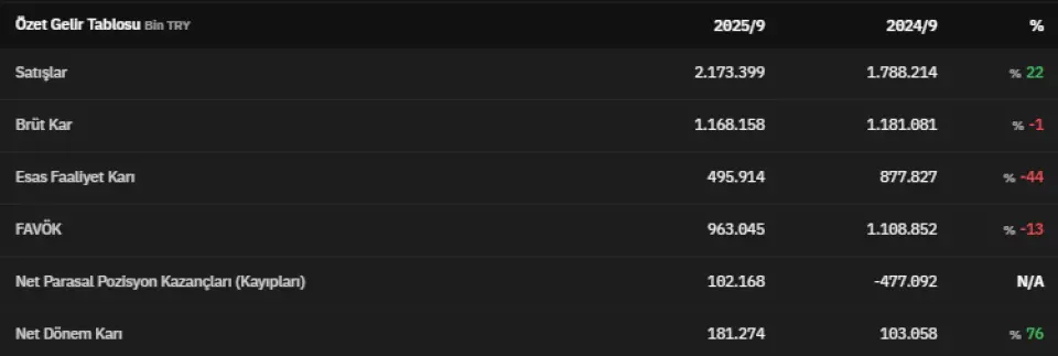 FAVÖK 2025 yılının üçüncü çeyreğinde 963.045.000 TL olarak açıklandı. Net parasal pozisyon kazançları 2025 yılının üçüncü çeyreğinde 102.168.000 TL olarak açıklandı. Net dönem kârı ise 181.274.000 TL olarak kaydedildi. İlgili veri 2024 yılının üçüncü çeyreğinde 103.058.000 TL olarak açıklanmıştı.