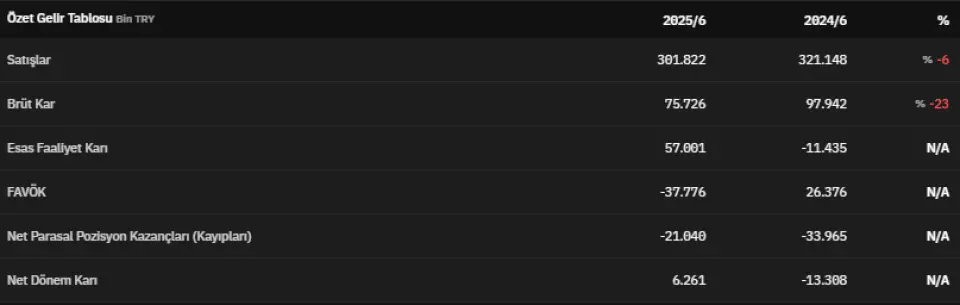 FAVÖK 2025 yılının ikinci çeyreğinde -37.776.000 TL olarak açıklanmıştır. Net Parasal Pozisyon Kazançları (Kayıpları) 2025 yılının ikinci çeyreğinde -21.040.000 TL olarak açıklanmıştır. Net dönem kârı ise 6.261.000 TL olarak kaydedildi. İlgili veri 2024 yılının ikinci çeyreğinde -13.308.000 TL olarak açıklanmıştı.