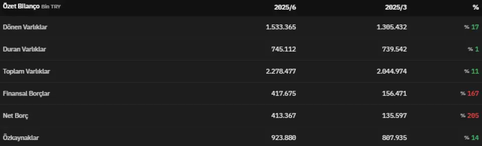 Dönen varlıklar 2025 yılının ikinci çeyreğinde 1.533.365.000 TL olmuştur. 2025 yılının ikinci çeyreğinde 745.112.000 TL olarak açıklanan duran varlıklar, 2025 yılının ilk çeyreğinde 739.542.000 TL olarak açıklanmıştı. Toplam varlıklar 2025 yılının ikinci çeyreğinde 2.278.477.000 TL olarak açıklanmıştır. 2025 yılının ilk çeyreğinde 2.044.974.000 TL olarak açıklanan toplam varlıklar, 2025 yılının ikinci çeyreğinde %11 artmış oldu.Finansal borçlar 2025 yılının ikinci çeyreğinde 417.675.000 TL olarak açıklandı. 2025 yılının ikinci çeyreğinde net borç 413.367.000 TL olarak açıklandı. Özkaynaklar 2025 yılının ikinci çeyreğinde 923.880.000 TL olarak kayıtlara geçti. 2025 yılının ilk çeyreğinde 807.935.000 TL olarak açıklanan özkaynaklar, 2025 yılının ikinci çeyreğinde %14 artmış oldu.