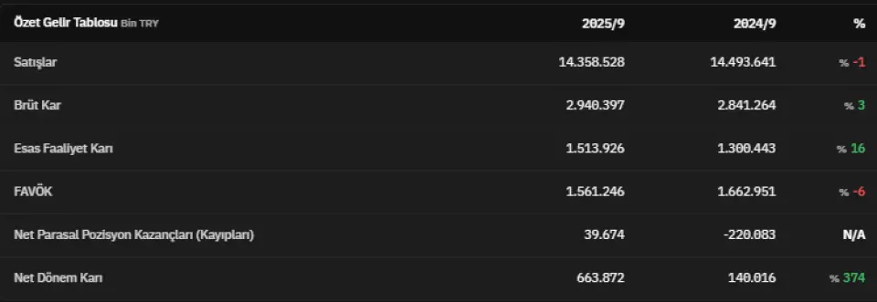 FAVÖK 2025 yılının üçüncü çeyreğinde 1.561.246.000 TL olarak açıklandı. Net parasal pozisyon kazançları 2025 yılının üçüncü çeyreğinde 39.674.000 TL olarak kaydedildi. Net dönem kârı ise 663.872.000 TL olarak kaydedildi. 2024 yılının üçüncü çeyreğinde 140.016.000 TL olarak açıklanan net dönem karı, 2025 yılının üçüncü çeyreğinde %374 artmış oldu.