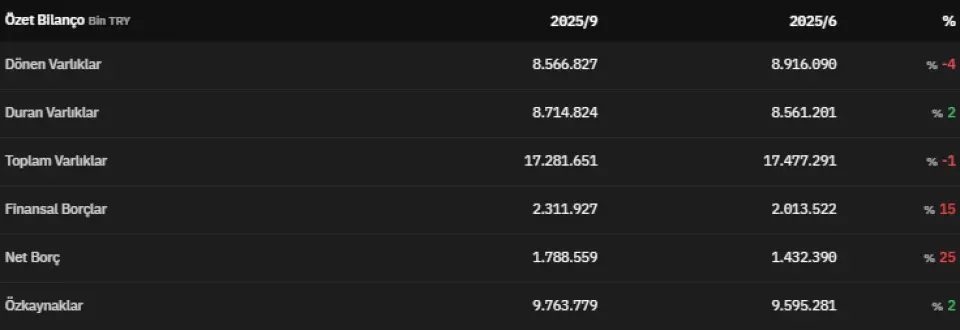 Dönen varlıklar 2025 yılının üçüncü çeyreğinde 8.566.827.000 TL olmuştur. 2025 yılının üçüncü çeyreğinde 8.714.824.000 TL olarak açıklanan duran varlıklar, 2025 yılının ikinci çeyreğinde 8.561.201.000 TL olarak açıklanmıştı. Toplam varlıklar üçüncü çeyrekte 17.281.651.000 TL olarak kaydedildi.