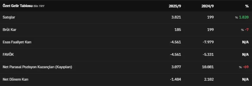 FAVÖK 2025 yılının üçüncü çeyreğinde -4.561.000 TL olarak açıklandı. Net parasal pozisyon kazançları 2025 yılının üçüncü çeyreğinde 3.077.000 TL olarak kaydedildi. Net dönem kârı ise -1.484.000 TL olarak kaydedildi.