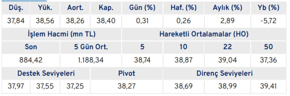 Gün içinde en düşük 37,84 en yüksek 38,56 seviyesini gören Şişe Cam hissesinin günü %0,31 kazançla tamamladığı gözlenmektedir. Pivot seviye 38,27 seviyesinden geçmekte olup, aşağı yönlü hareketlerde birinci destek 37,97, ikinci destek ise 37,55 seviyesinde geçmektedir. Dirençler ise sırasıyla 38,69, 38,99 seviyelerinden geçmektedir. Bu aşamada 5 günlük HO seviyesinin %0,89 altında, 22 günlük HO seviyesinin ise %1,63