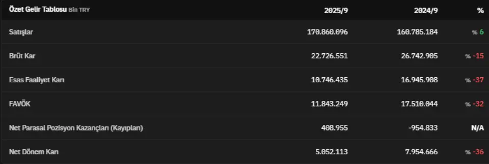 FAVÖK 2025 yılının üçüncü çeyreğinde 11.843.249.000 TL olarak açıklandı. Net parasal pozisyon kazançları 2025 yılının üçüncü çeyreğinde 408.955.000 TL olarak kaydedildi. Net dönem kârı ise 5.052.113.000 TL olarak kaydedildi.
