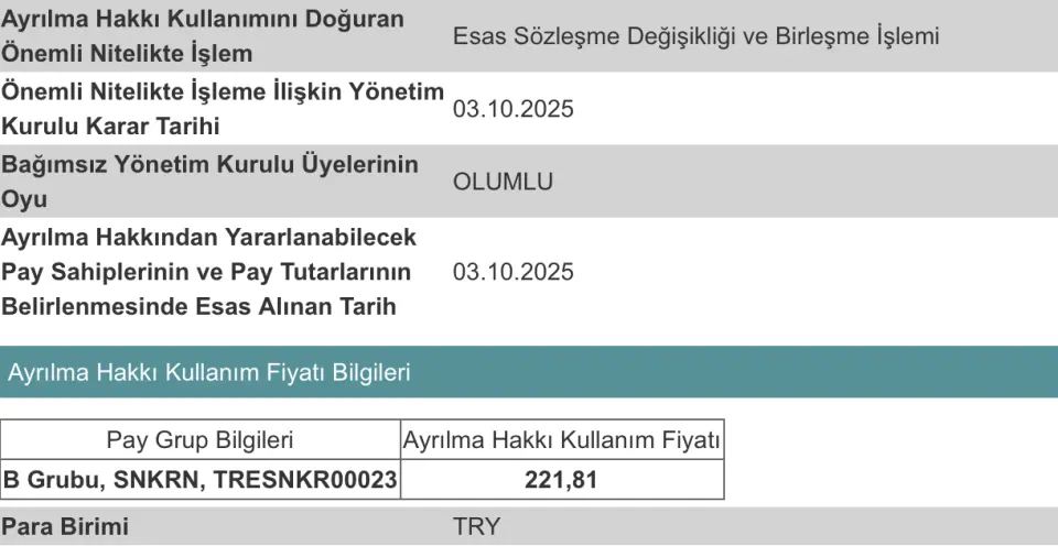 SNKRN Ayrılma Hakkı Kullanım Fiyatı 221,81 TL Olarak Belirledi! Şirketin Esas Sözleşme Değişikliği ve Birleşme İşlemine Yönelik Ayrılma Hakkı Hakkında Şirketten Gelen KAP Açıklaması Hemen Haberimizin Devamında Yer Almaktadır.