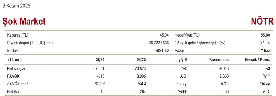 Şok Market, 3Ç25’te 264 milyon TL net kâr açıkladı (3Ç24: 40 milyon TL). Piyasa medyan beklentisi 66 milyon TL net zarar yönündeydi. Ciro artışı beklentilerin bir miktar üzerinde gerçekleşirken, FAVÖK marjındaki toparlanma tahminleri aştı. Daha yüksek ciro - Şok, 3Ç25’te 70,9 milyar TL ciro elde etti (yıllık %4,8 artış). Şirket, çeyrek dönemde yalnızca 20 yeni mağaza açarak toplam mağaza sayısını 11.057’ye çıkardı (yıllık %0,9 artış). Mağaza başına ciro yıllık bazda %3,9 yükseldi. Benzer mağaza satışları yıllık %3,4 artarken, bu büyüme %1,9 trafik artışı ve %1,5 sepet büyüklüğü artışıyla desteklendi. Daha yavaş mağaza açılış stratejisi, trafik büyümesini destekliyor görünüyor. Yönetim, 9A25’teki %4,3’lük artışa paralel olarak ciro büyüme hedefini %4-8 aralığında korudu.
