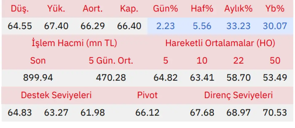 Gün içinde en düşük 64.55 en yüksek 67.40 seviyesini gören Şok Marketler Ticaret hissesinin günü %2.23 kazançla tamamladığı gözlenmektedir. Pivot seviye 66.12 seviyesinden geçmekte olup, aşağı yönlü hareketlerde birinci destek 64.83, ikinci destek ise 63.27 seviyesinden geçmektedir. Dirençler ise sırasıyla 67.68, 68.97 seviyelerinden geçmektedir. Bu aşamada endeksin 5 günlük HO seviyesinin %2.44 üstünde, 22 günlük HO seviyesinin ise %13.11 üstünde hareket ettiği dikkat çekmektedir. Son gün işlem hacmi ise bu aşamada 5 günlük ortalama işlem hacminin % 91.36 üstünde gerçekleşmiştir.