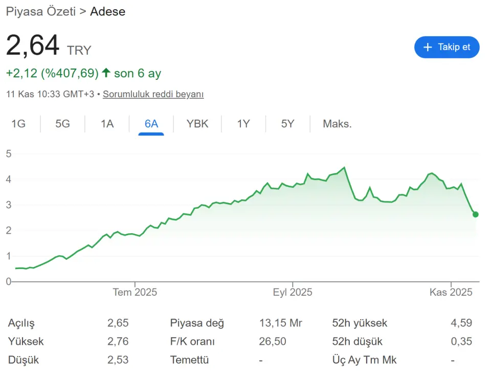 Adese hisse payları son 6 ayda %400 oranında değer kazanmış. Yatırımcının parasını 5 katına çıkarmış. Hisse son 1 ayda ise %23'lük bir değer kaybı göstermiş. Son 5 günde ise 3 adet taban yaparak düşüşünü %27 olarak göstermiş. Adese bugün itibariyle %5'lik bir kayıp yaşıyor.