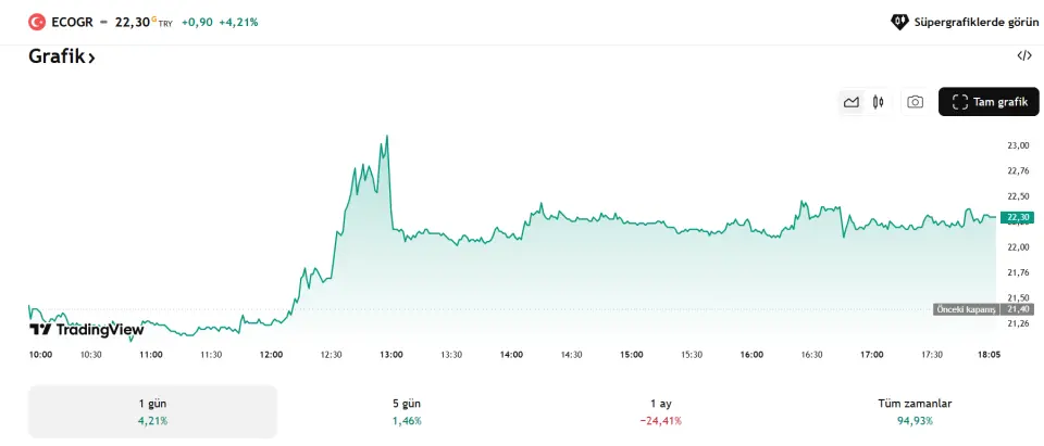 Ecogreen Enerji Holding A.Ş., kısa süre önce gerçekleşen halka arzın ardından borsada dikkat çeken şirketler arasında yer aldı. 11 TL fiyatla işlem görmeye başlayan hisse, ilk günlerden itibaren sergilediği güçlü performansla yatırımcıların odağına yerleşti. Kısa sürede 10 kez tavan yapan Ecogreen Enerji, 26,64 TL seviyesine kadar yükselerek yatırımcısına yaklaşık %95 oranında getiri sağladı.