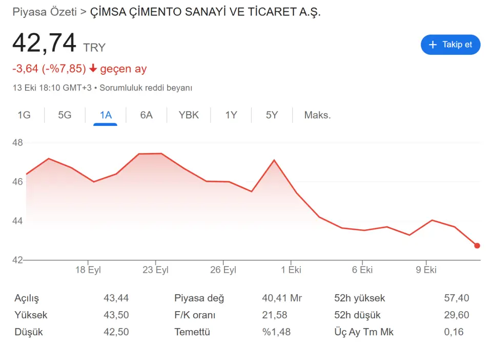 CIMSA payları son işlem gününde %2.2 değer kaybetmişti. Şirket son 5 günlük performansına bakıldığında ise %1.97'lik bir düşüş göstermiş. 1 aylık performansında ise yine düşüş göstererek %7.85'lik değer kaybı yaşamış. CIMSA'nın son 6 aylık performansında bakıldığında ise %13.87'lik bir düşüş görülmekte. Şirketin piyasa değeri 40.41 milyar TL iken temetçi oranı %1.48 olarak görünüyor. 52 haftanın en yüksek fiyatı 57.40 TL iken 52 haftanın en düşük fiyatı 29.60 TL. Çimsa payları şu anda 42.74 TL'den işlem görmekte.