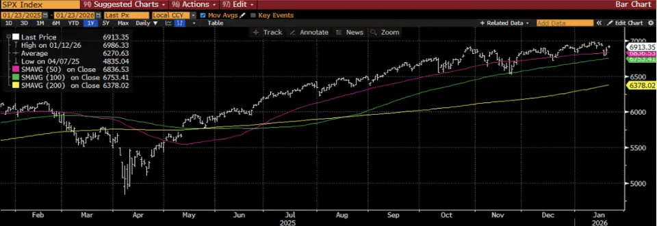 S&P 500 endeksi, son işlem gününü %0,55 artarak 6913,35 puanda tamamladı. ABD ile Avrupa arasındaki Grönland anlaşmazlığının NATO ittifakı içinde çözülmesi küresel risk iştahının yeniden canlanmasına neden oluyor. Bloomberg’de paylaşılan 12 aylık ortalama S&P 500 endeks hedefi 8.050 puan ile dolar bazında %16,4 yükseliş potansiyeline işaret ediyor. Teknik açıdan yakın vadede 7.120 puan direnç seviyesi, 6.745 puan ise destek seviyesi olarak takip edilebilir.