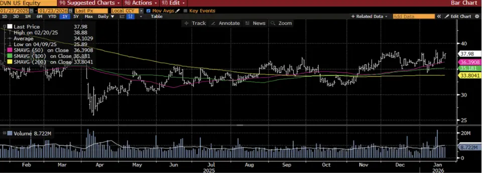 DVN, ağırlıklı olarak ABD’de faaliyet gösteren bağımsız bir petrol ve doğal gaz arama-üretim şirketidir. Şirketin ana faaliyet odağı, Permian, Eagle Ford ve Anadarko havzalarında hidrokarbon üretimi olup, operasyonlarını disiplinli sermaye harcamaları ve güçlü nakit akışı yaratımı üzerine konumlandırmaktadır. Hisse için Bloomberg’de yer alan analist beklentileri 12 aylık vadede ortalama 45,06 USD hedef fiyata ve son kapanış fiyatına göre %18,6 getiri potansiyeline işaret ediyor. S&P 500 endekisinin üzerinde bir getiri potansiyeline sahip olsa da, önümüzdeki dönemde hedef fiyatın yapılacak revizyonlarla endeks getirisinin üzerinde kalacağını öngörüyoruz. Hisse için 25 analist AL, 10 analist TUT tavsiyesi veriyor. Teknik açıdan yakın vadede 41,7 USD direnç, 35,4 USD ise destek seviyesi olarak takip edilebilir.